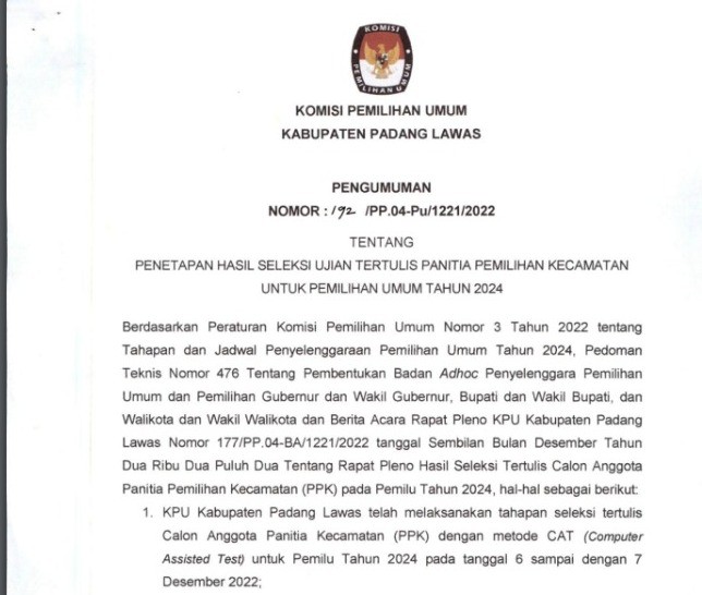 Ketua KPU Padang Lawas, Indra Alamsyah, menyatakan bahwa pleno Hari pertama dimulai dari kecamatan Sosopan, Ulu Barumun, Barumun, Barumun Selatan dan Barumun Baru. untuk Hari kedua akan di lanjutkan dengan kecamatan Barumun Tengah, Huristak, Lubuk Barumun, Aek Nabara Barumun, Sihapas Barumun dan Barumun Barat. Dan Pada Hari Ketiga dilanjutkan dengan kecamatan Hutaraja Tinggi, Sosa, Batang Lubu Sutam, Ulu Sosa, Sosa Julu dan Kecamatan Sosa Timur.