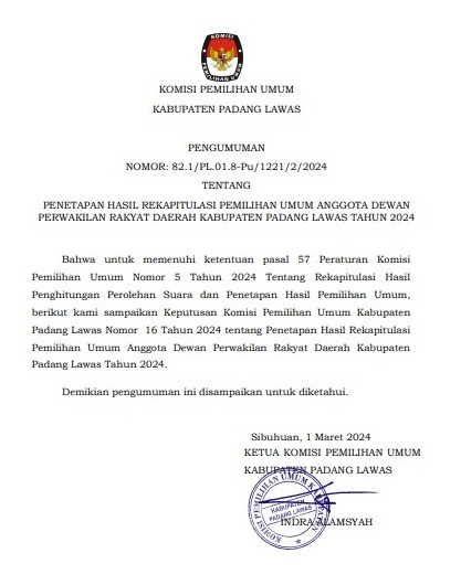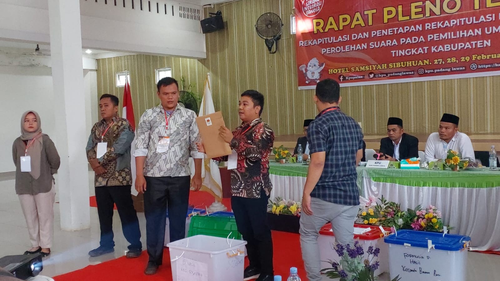 Komisi Pemilihan Umum (KPU) Kabupaten Padang Lawas laksanakan Rapat Pleno terbuka rekapitulasi hasil penghitungan perolehan suara Pemilu 2024 tingkat Kabupaten Padang Lawas pada Selasa (01/03/24).
