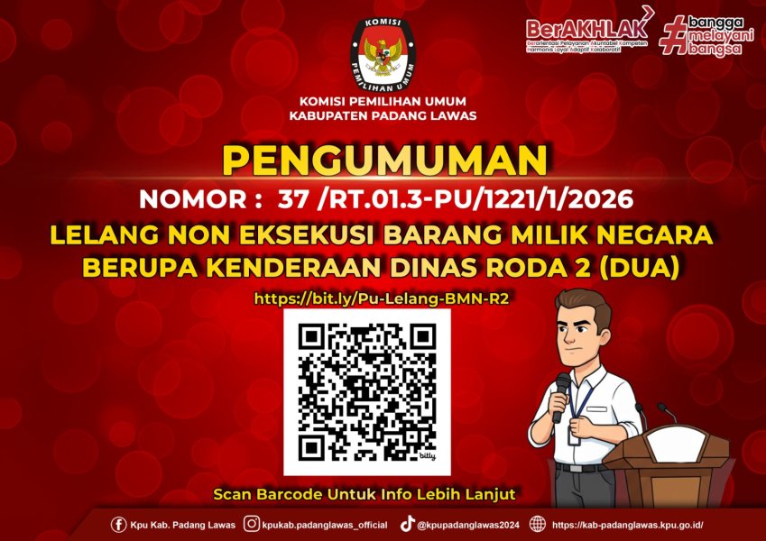 Komisi Pemilihan Umum Kabupaten Padang Lawas dengan perantaraan Kantor Pelayanan Kekayaan Negara dan Lelang (KPKNL) Padangsidimpuan akan melaksanakan Lelang Non Eksekusi Barang Milik Negara berupa Kenderaan Dinas Roda 2 (dua). Selengkapnya...