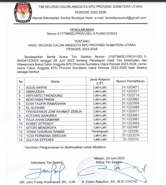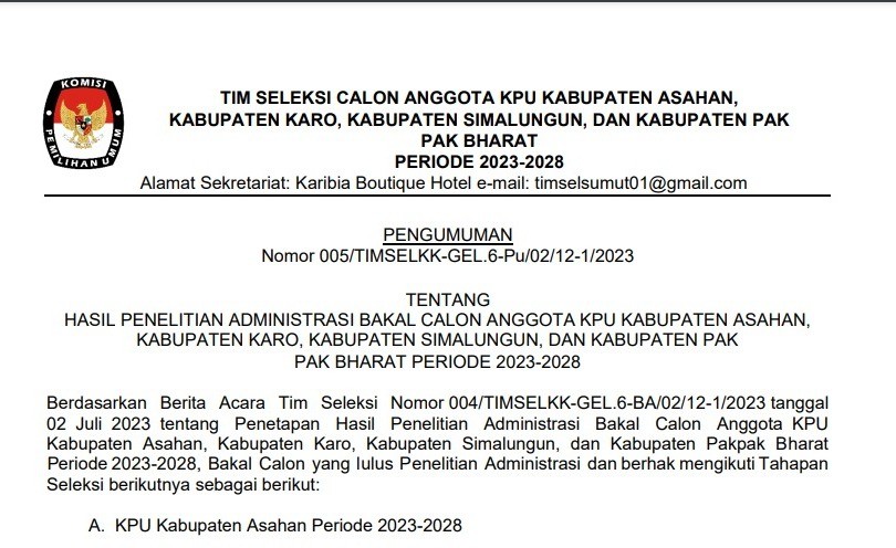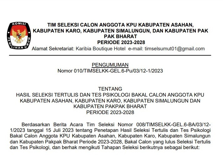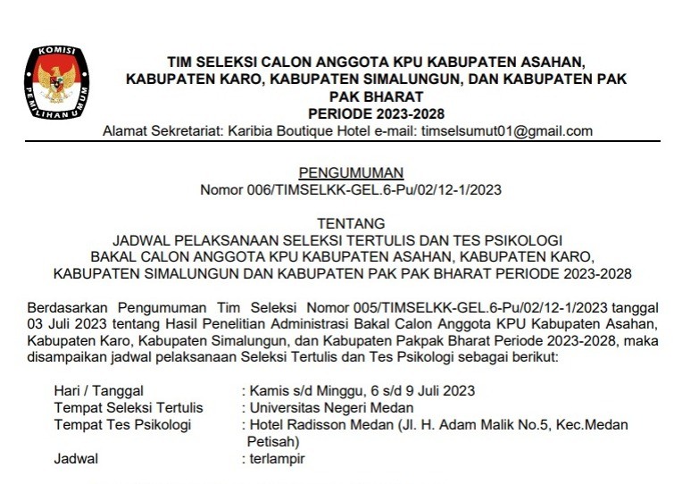 Berikut kami sampaikan Pengumuman jadwal pelaksanaan Seleksi Tertulis dan Psikologi Calon Anggota KPU Kabupaten/Kota Periode 2023 s/d 2028.