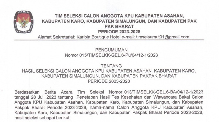 Zona 1: KPU Kabupaten Asahan, Kabupaten Karo, Kabupaten Simalungun, dan Kabupaten Pakpak Bharat Periode 2023-2028