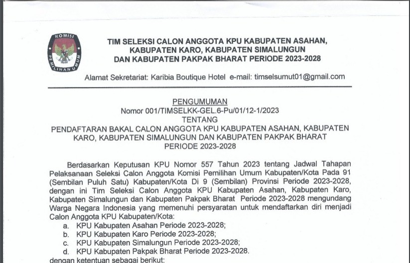 Pengumuman Pendaftaran Bakal Calon Anggota KPU Kabupaten Asahan, Kabupaten Karo, Kabupaten Simalungun dan Kabupaten Pakpak Bharat Periode 2023-2028 Rabu, 14 Juni 2023 07:00 397 Selengkapnya.... Baca Selengkapnya