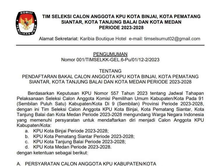 Pengumuman Pendaftaran Bakal Calon Anggota KPU Kota Binjai, Kota Pematang Siantar, Kota Tanjung Balai dan Kota Medan Periode 2023-2028 Rabu, 14 Juni 2023 07:00 387 Selengkapnya... Baca Selengkapnya