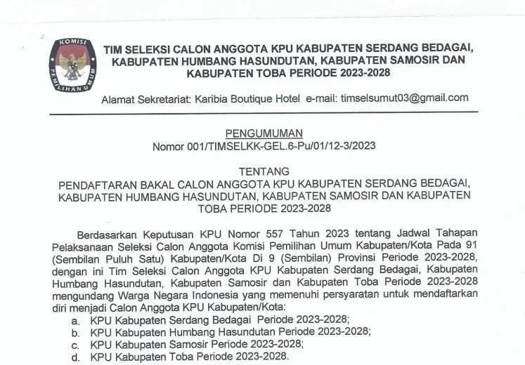 Pengumuman Pendaftaran Bakal Calon Anggota KPU Kabupaten Serdang Bedagai, Kabupaten Humbang Hasundutan, Kabupaten Samosir dan Kabupaten Toba Periode 2023-2028 Rabu, 14 Juni 2023 07:00 430 Selengkapnya... Baca Selengkapnya