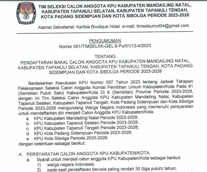 Pengumuman Pendaftaran Bakal Calon Anggota KPU Kabupaten Mandailing Natal, Kabupaten Tapanuli Selatan, Kabupaten Tapanuli Tengah, Kota Padang Sidempuan dan Kota Sibolga Periode 2023-2028 Rabu, 14 Juni 2023 07:00 396 Selengkapnya... Baca Selengkapnya