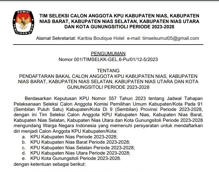 Pengumuman Pendaftaran Bakal Calon Anggota KPU Kabupaten Nias, Kabupaten Nias Barat, Kabupaten Nias Selatan, Kabupaten Nias Utara dan Kota Gunungsitoli Periode 2023-2028 Rabu, 14 Juni 2023 07:00 380 Selengkapnya... Baca Selengkapnya