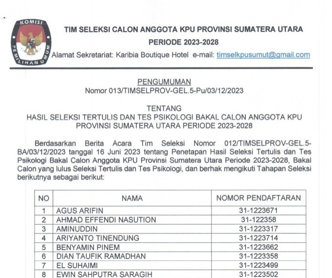 Pengumuman Hasil Seleksi Tertulis dan Tes Psikologi Bakal Calon Anggota KPU Provsu 2023-2028 Sabtu, 17 Juni 2023 07:00 501 Penetapan Hasil Seleksi Tertulis dan Tes Psikologi Bakal Calon Anggota KPU Provinsi Sumatera Utara Periode 2023-2028. Download Pengumuman... Baca Selengkapnya