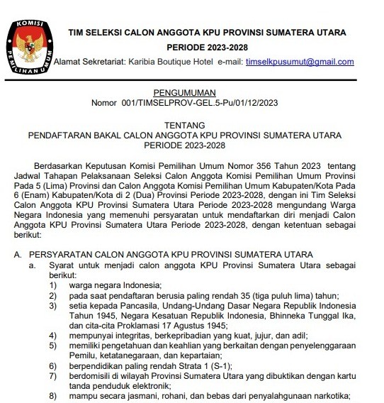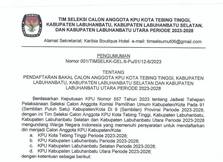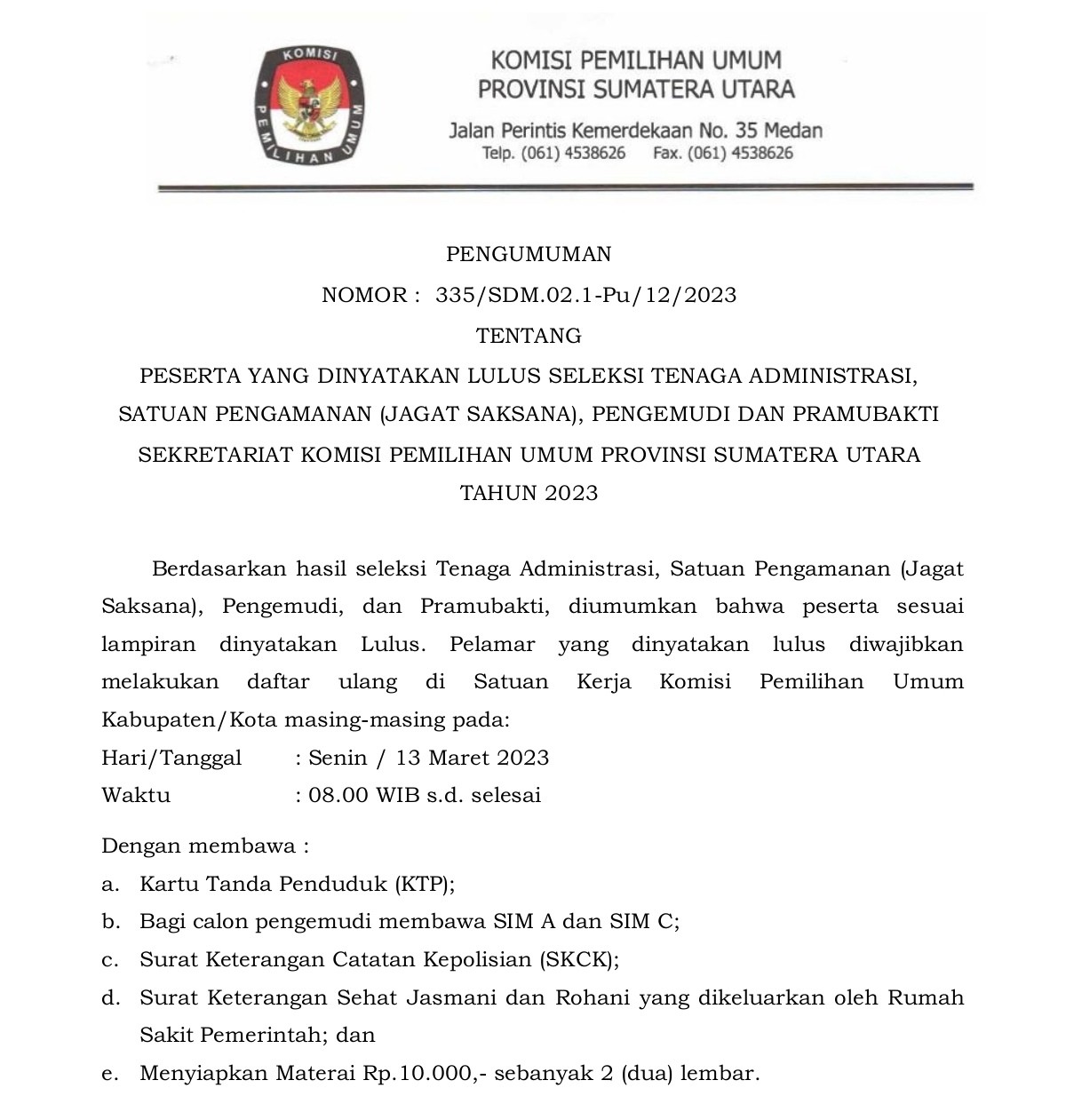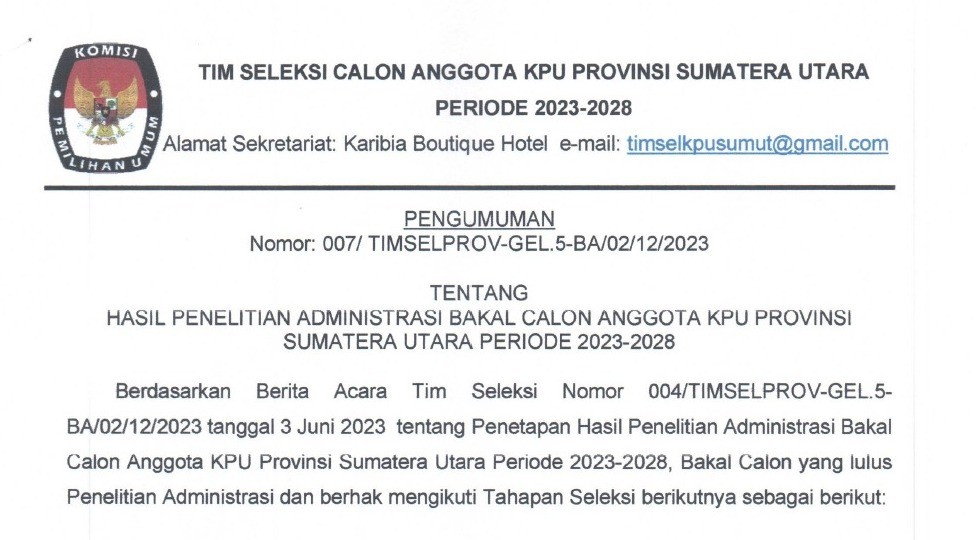 Berdasarkan hasil seleksi Tenaga Administrasi, Satuan Pengamanan (Jagat Saksana), Pengemudi, dan Pramubakti, diumumkan bahwa peserta sesuai lampiran dinyatakan Lulus. Pelamar yang dinyatakan lulus diwajibkan melakukan daftar ulang di Satuan Kerja Komisi Pemilihan Umum Kabupaten/Kota masing-masing .