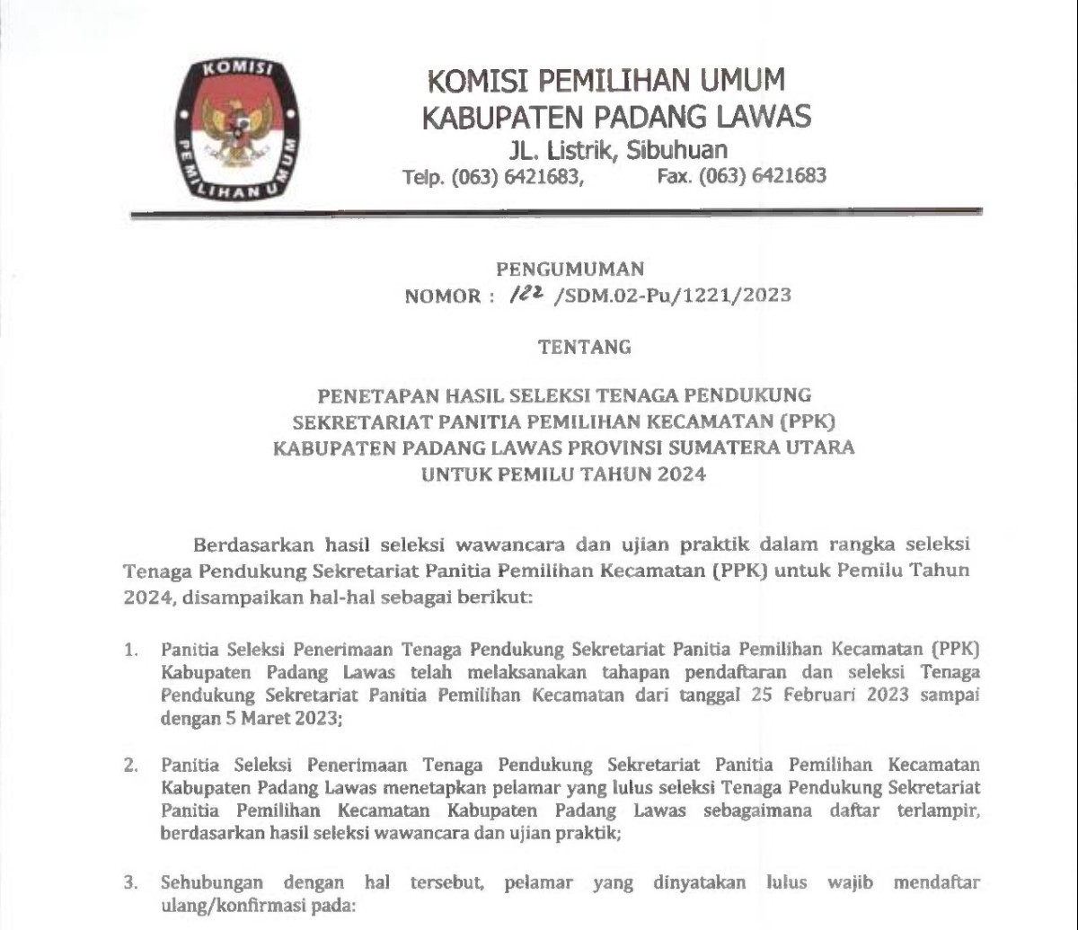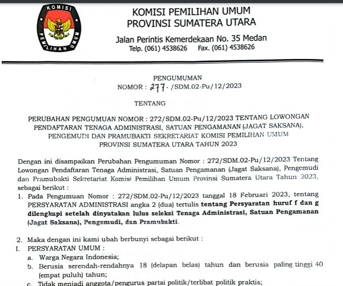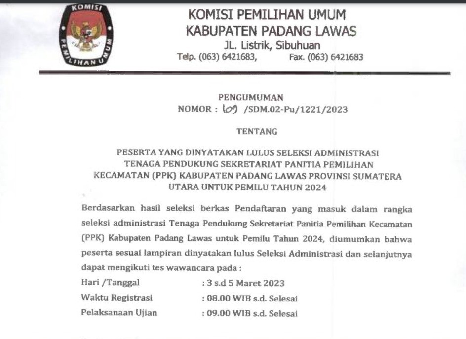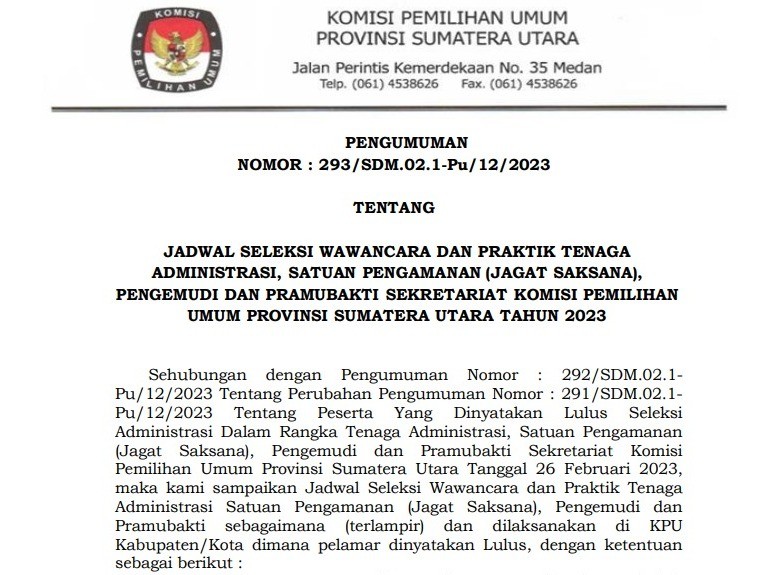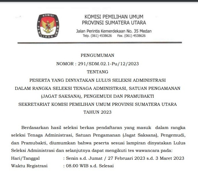 Berdasarkan hasil seleksi berkas pendaftaran yang masuk seleksi Tenaga Administrasi, Satuan Pengamanan (Jagat Saksana), Pengemudi, dan Pramubakti, diumumkan bahwa peserta sesuai lampiran dinyatakan Lulus Seleksi Administrasi dan selanjutnya dapat mengikuti tes wawancaraBerdasarkan hasil seleksi berkas pendaftaran yang masuk seleksi Tenaga Administrasi, Satuan Pengamanan (Jagat Saksana), Pengemudi, dan Pramubakti, diumumkan bahwa peserta sesuai lampiran dinyatakan Lulus Seleksi Administrasi dan selanjutnya dapat mengikuti tes wawancara.