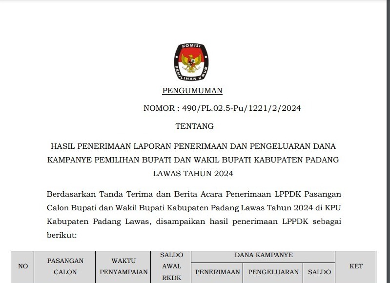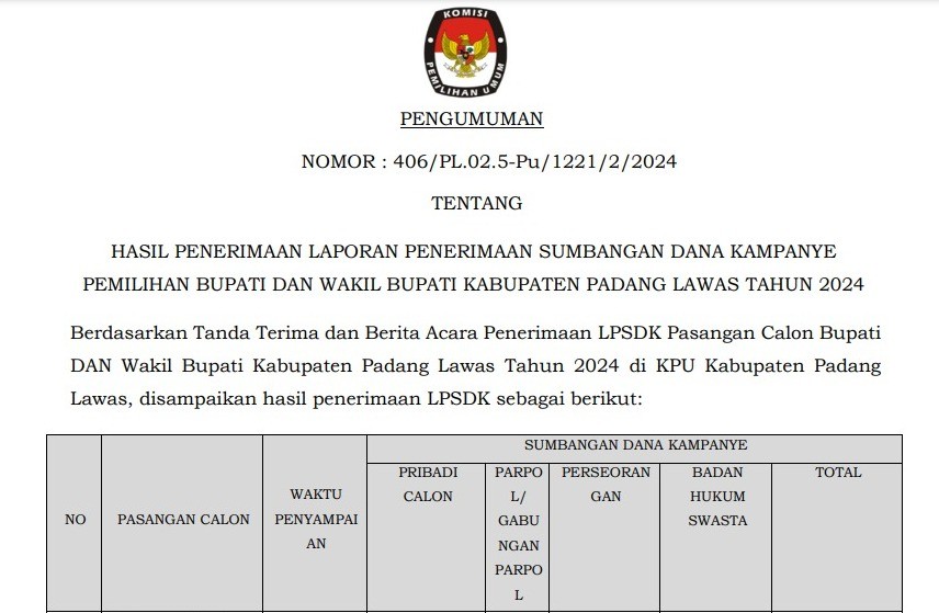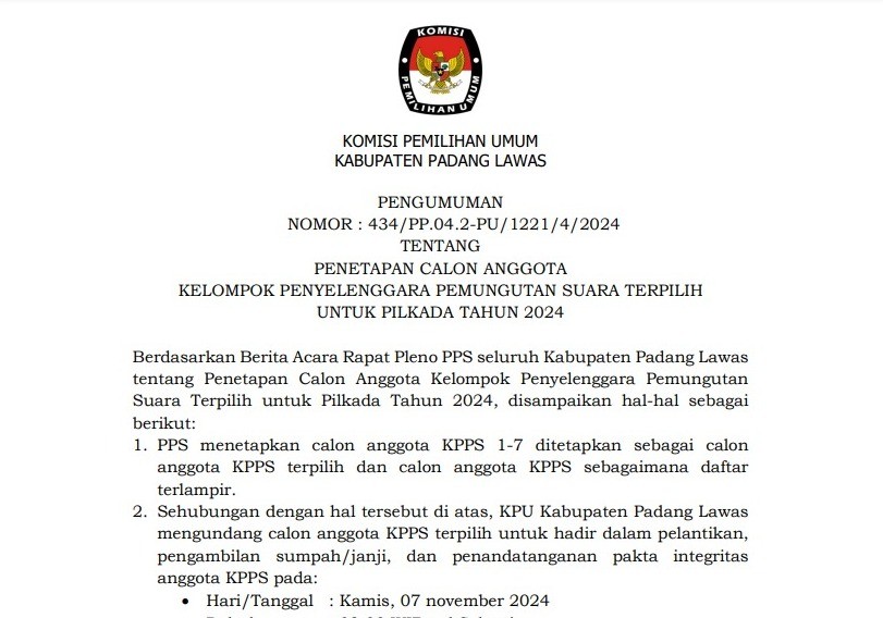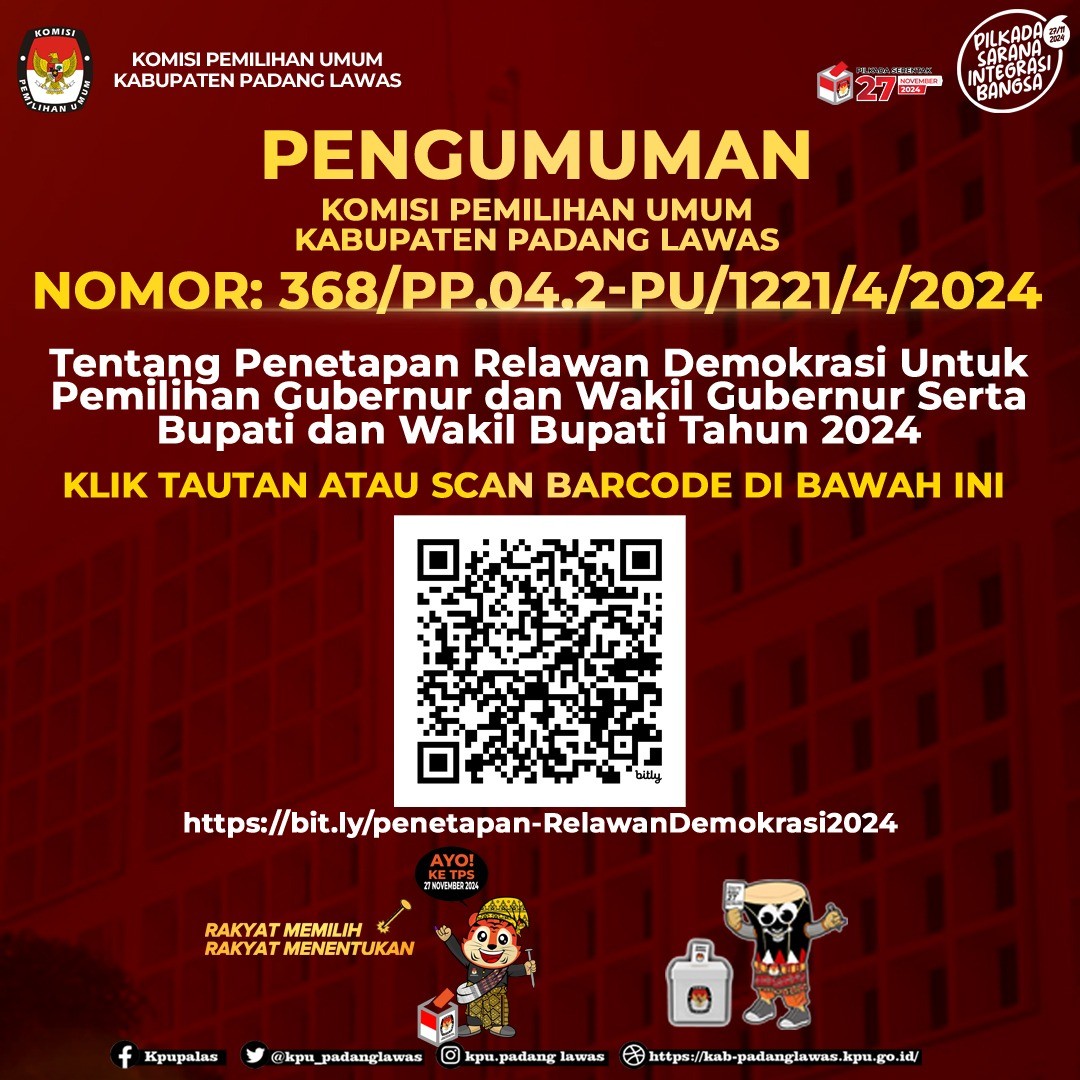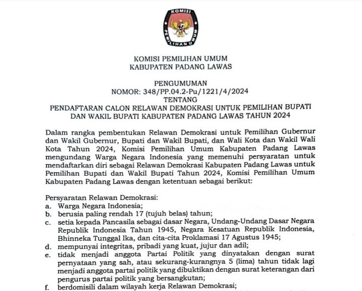 Dalam rangka pembentukan Relawan Demokrasi untuk Pemilihan Gubernur dan Wakil Gubernur, Bupati dan Wakil Bupati, dan Wali Kota dan Wakil Wali Kota Tahun 2024, Komisi Pemilihan Umum Kabupaten Padang Lawas mengundang Warga Negara Indonesia yang memenuhi persyaratan untuk mendaftarkan diri sebagai Relawan Demokrasi Kabupaten Padang Lawas untuk Pemilihan Bupati dan Wakil Bupati Tahun 2024, Komisi Pemilihan Umum Kabupaten Padang Lawas dengan ketentuan sebagai berikut:
