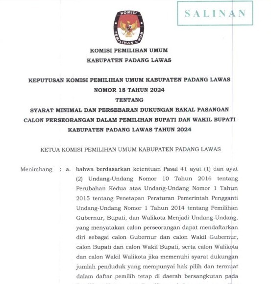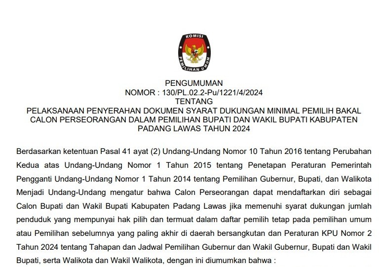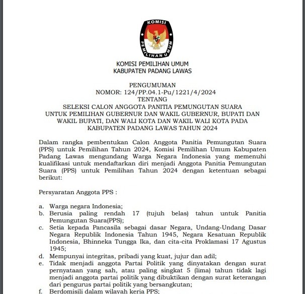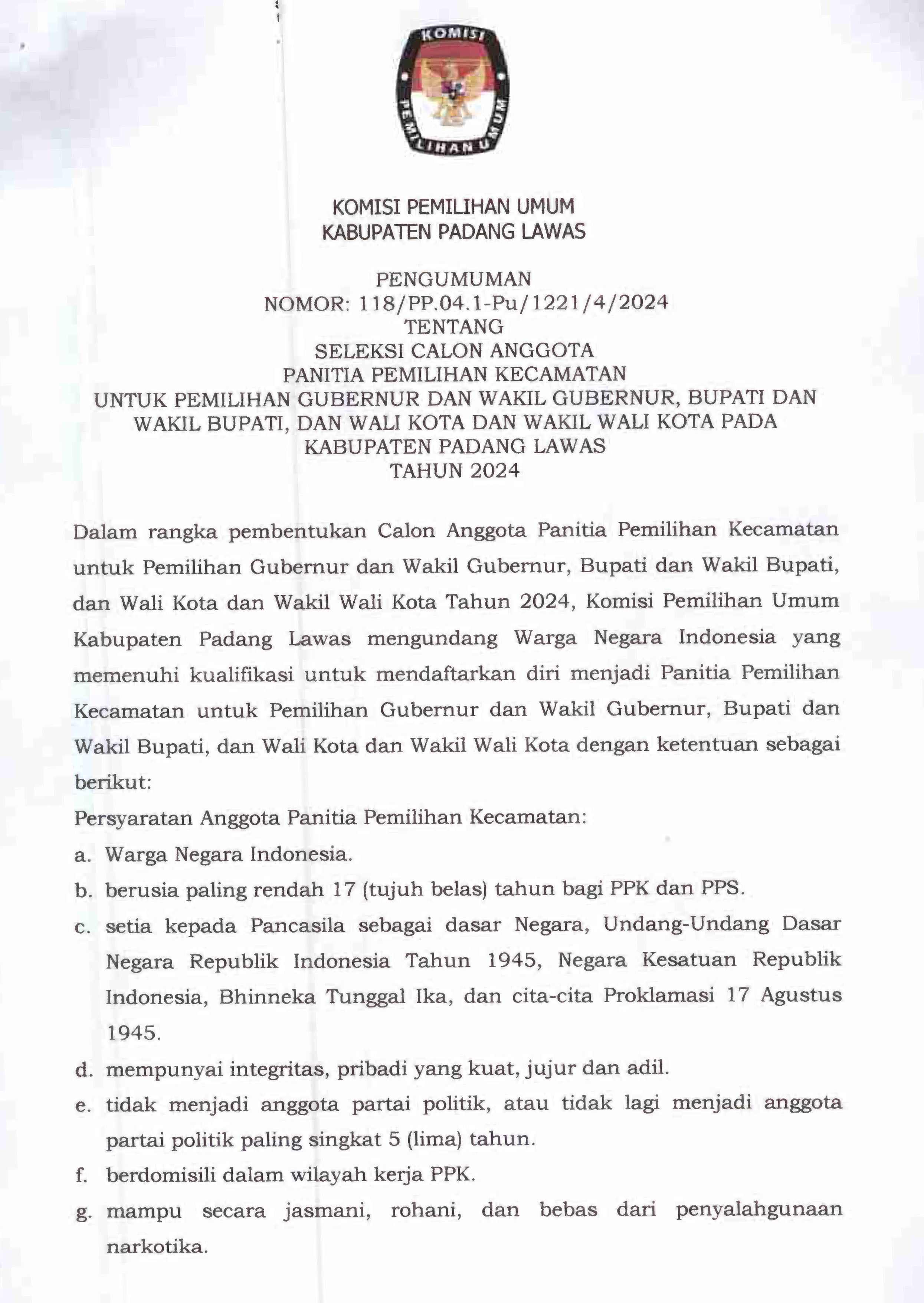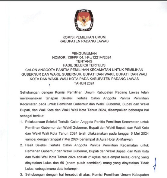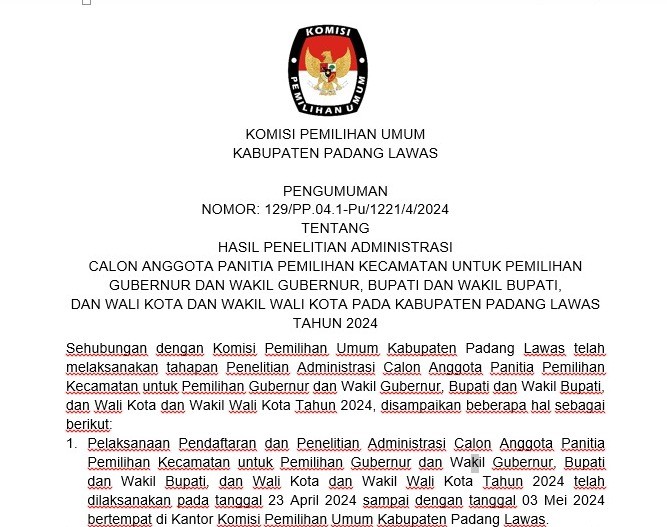Sehubungan dengan Komisi Pemilihan Umum Kabupaten Padang Lawas telah melaksanakan tahapan Penelitian Administrasi Calon Anggota Panitia Pemilihan Kecamatan untuk Pemilihan Gubernur dan Wakil Gubernur, Bupati dan Wakil Bupati, dan Wali Kota dan Wakil Wali Kota Tahun 2024, disampaikan beberapa hal sebagai berikut: